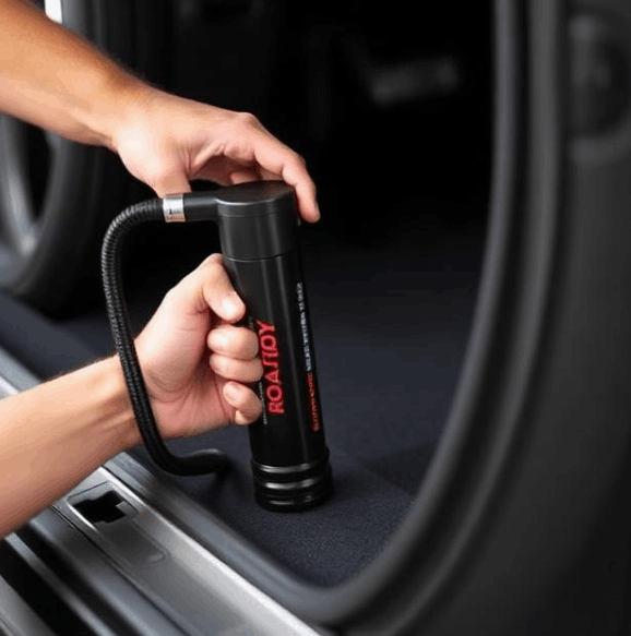 This pump helps maintain proper tire pressure. Its compact size allows convenient trunk storage. The design enables quick inflation. Suitable for passenger vehicles. Made from durable materials.
